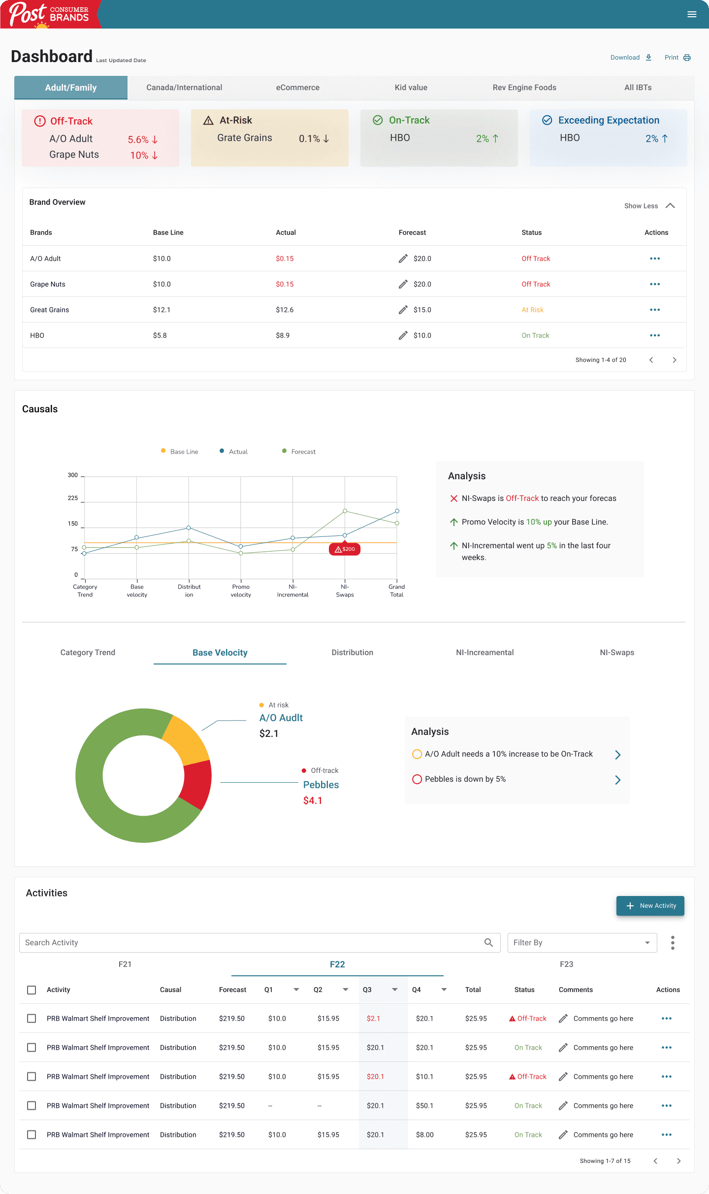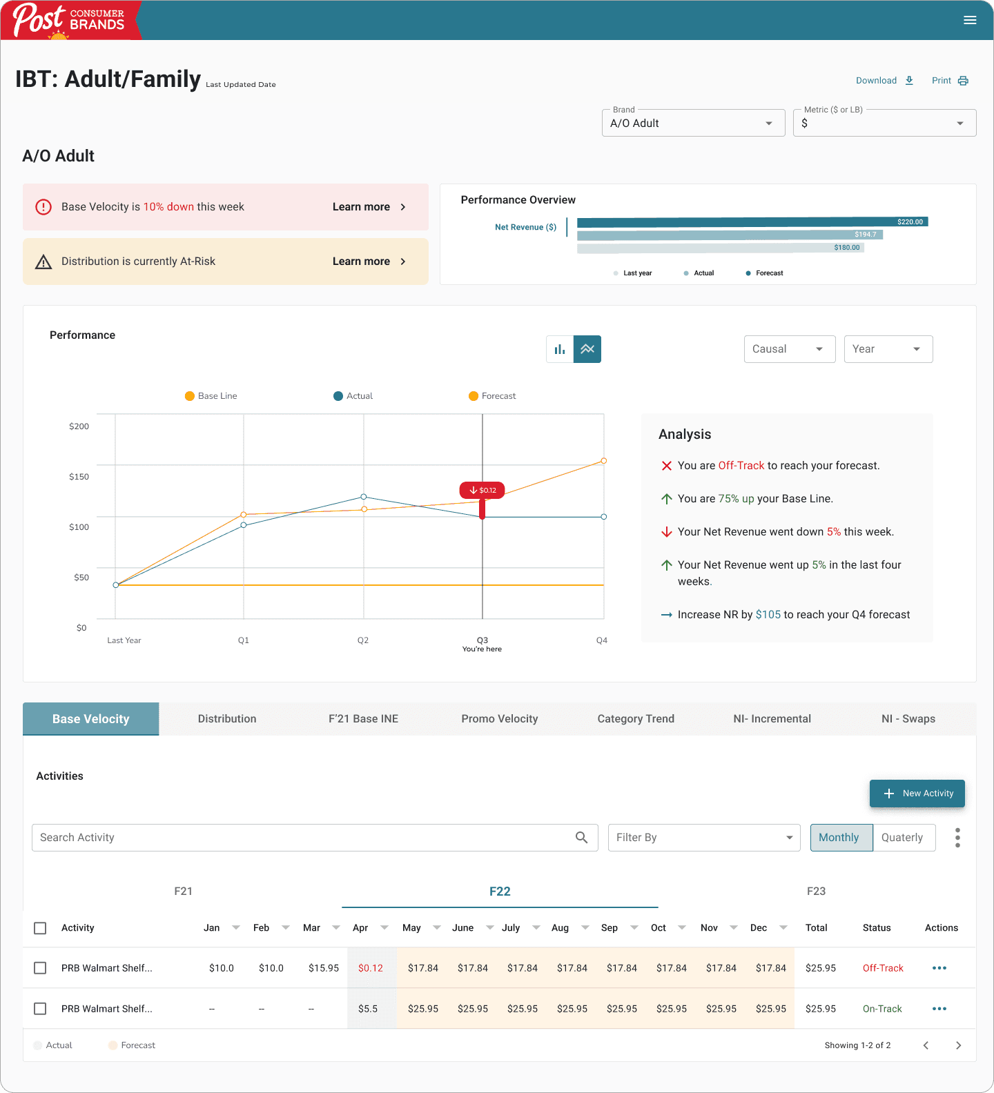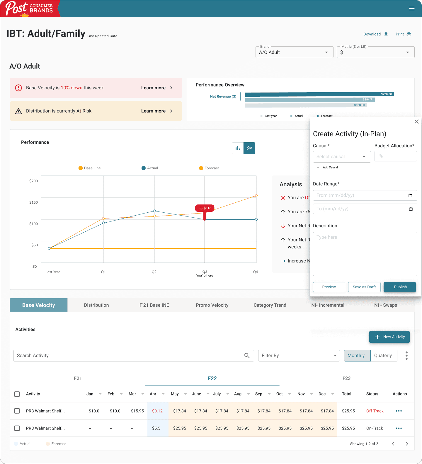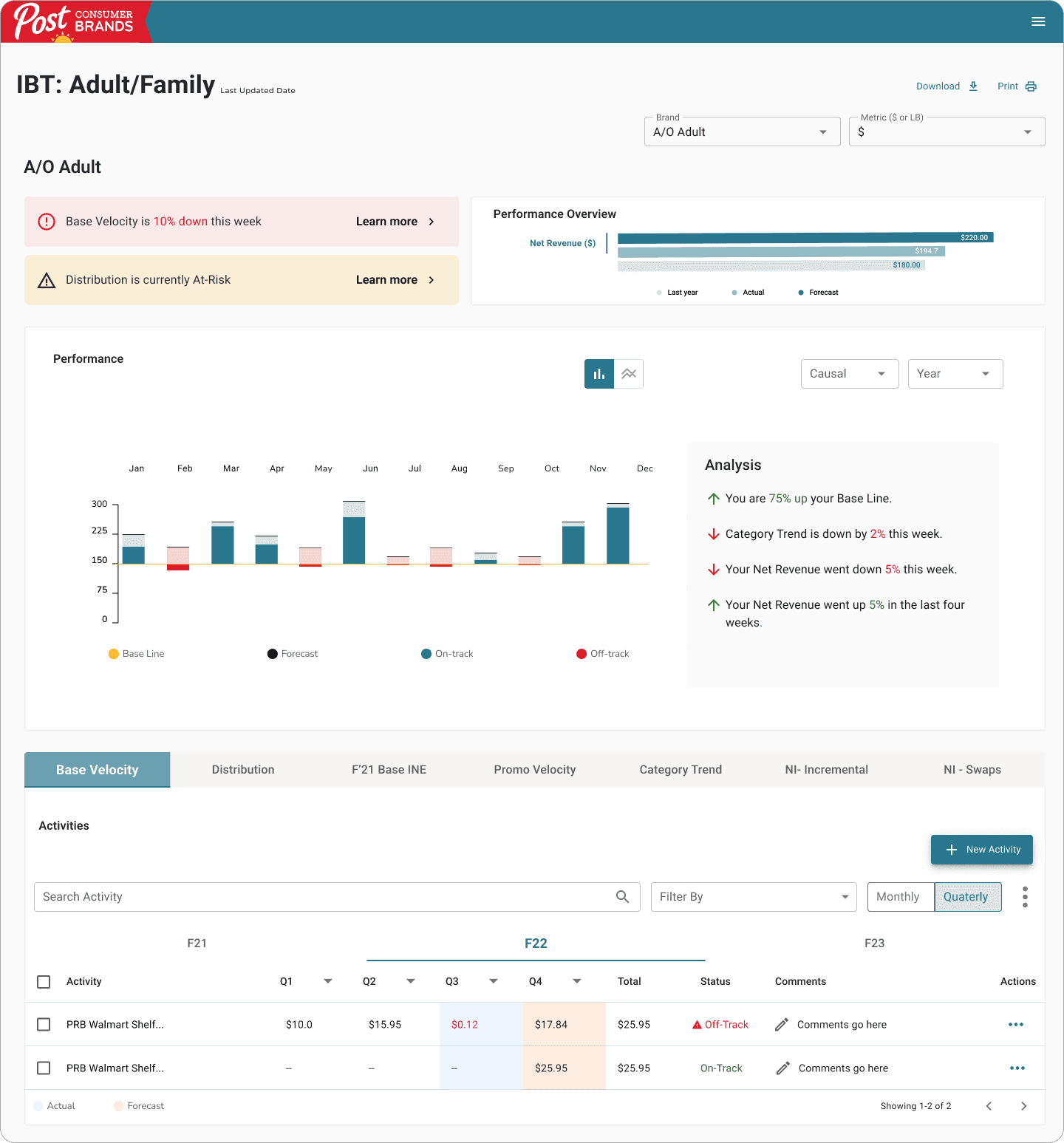 The IBT overview allows users to quickly identify the brands that are off-track, on-track, and at-risk within an specific IBT.